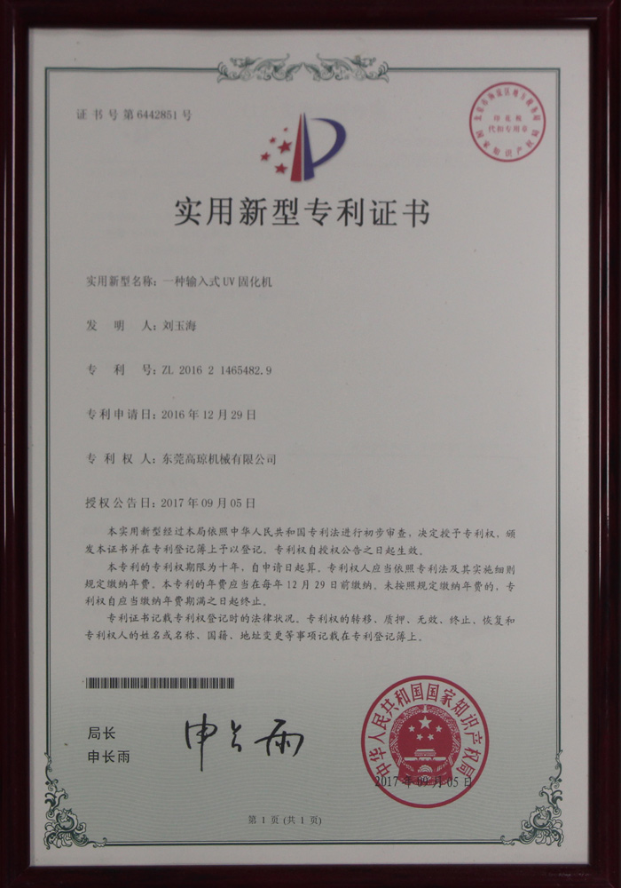 手提式UV固化裝置專(zhuān)利證書(shū)